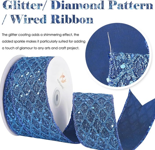 HUIHUANG Navy Blue Wired Ribbon 2.5 inch Glitter Diamond Mesh Wire Edge Ribbon for Christmas Tree, Wreaths, Garland, Gift Wrapping, Bows Making, Holiday Decor -10 Yards