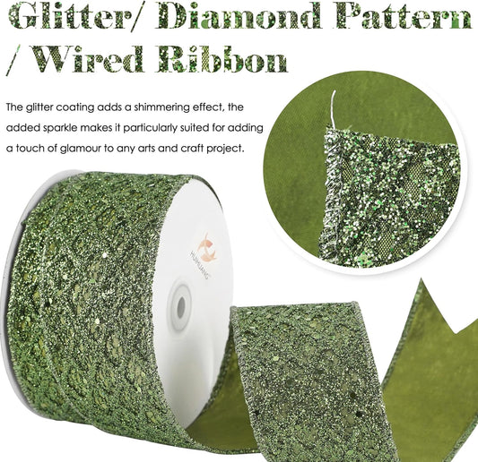 HUIHUANG Moss Green Wired Ribbon for Christmas Tree 2.5 inch Glitter Moss Diamond Mesh Ribbon for Tree Decoration, Wreaths, Garland, Gift Wrapping, Bows Making, Thanksgiving Decor -10 Yards