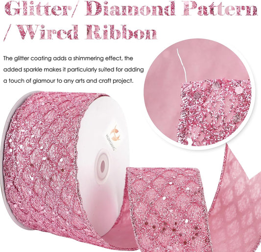 HUIHUANG Pink Glitter Wired Ribbon for Christmas Tree 2.5 inch Light Pink Diamond Mesh Wire Ribbon for Tree Decoration, Wreaths, Garland, Gift Wrapping, Bows Making, Home Decor -10 Yards