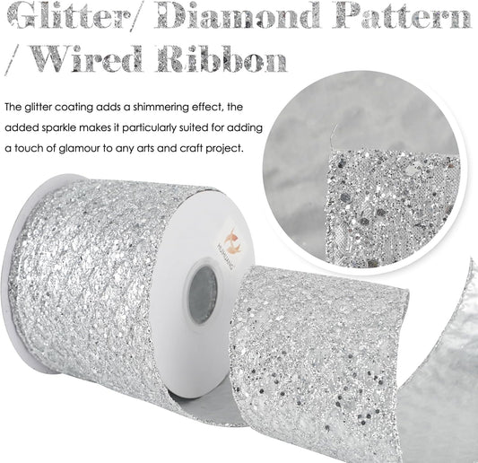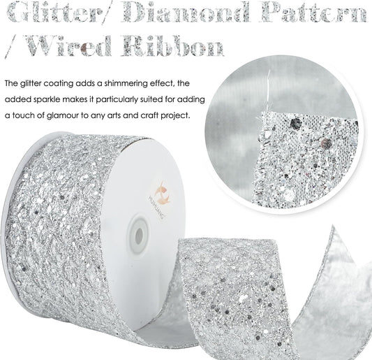 HUIHUANG Silver Glitter Wired Ribbon for Christmas Tree 2.5 inch Silver Diamond Mesh Ribbon for Tree Decoration, Wreaths, Garland, Gift Wrapping, Large Bows Making, Home Decor -10 Yards