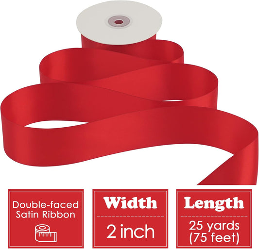 HUIHUANG Red Ribbon 2 inch Double Face Satin Ribbon Red Fabric Ribbon, 25 Yards/Roll for Crafts, Gift Wrapping, Flower Bouquet Wrap, Wedding Bridal Shower Holiday Decor, Hair Bows