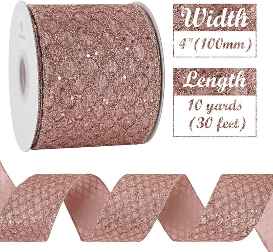 HUIHUANG Rose Gold Christmas Ribbon 4 inch Rose Gold Glitter Wired Ribbon Diamond Mesh Wire Ribbon for X-mas Tree Decorations, Wreaths, Garland, Large Bows Making, Home Decor -10 Yards
