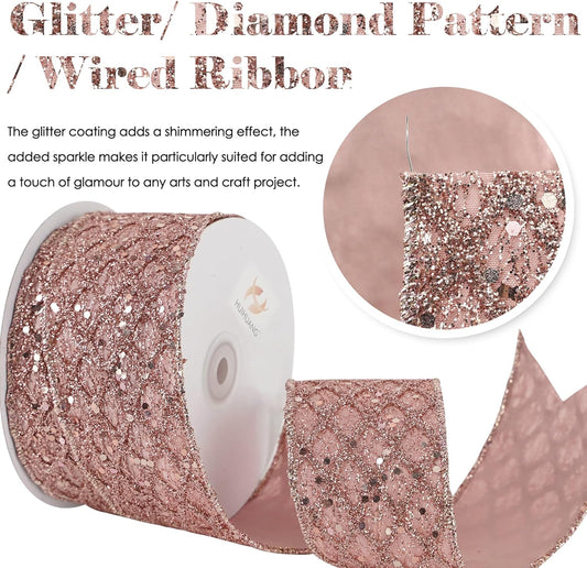 HUIHUANG Rose Gold Glitter Wired Ribbon for Christmas Tree 2.5 inch Rose Gold Diamond Mesh Ribbon for Tree Decoration, Wreaths, Garland, Gift Wrapping, Bows Making, Home Decor -10 Yards