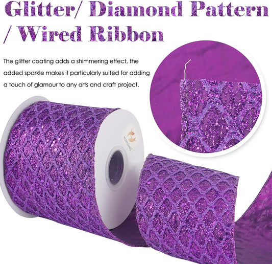 HUIHUANG Purple Wired Christmas Ribbon 4 inch Purple Glitter Wired Ribbon Diamond Mesh Wire Ribbon for X-mas Tree Decorations, Wreaths, Garland, Large Bows Making, Home Decor -10 Yards