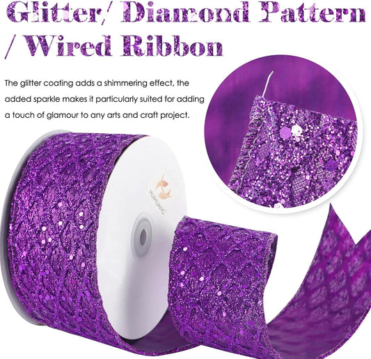 HUIHUANG Purple Wired Ribbon for Christmas Tree 2.5 inch Purple Glitter Diamond Mesh Ribbon for Tree Decoration, Wreaths, Garland, Gift Wrapping, Large Bows Making, Halloween Decor -10 Yards