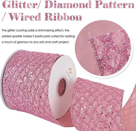 HUIHUANG Pink Wired Christmas Ribbon 4 inch Light Pink Glitter Wired Ribbon Diamond Mesh Wire Ribbon for X-mas Tree Decorations, Wreaths, Garland, Large Bows Making, Home Decor -10 Yards
