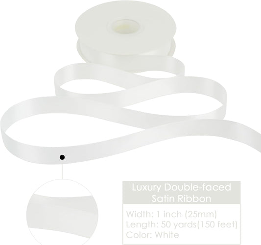 HUIHUANG White Satin Ribbon 1 inch x 50 Yards Double-Faced Polyester Silk Satin Ribbon for Gift Wrapping, Invitations, Hair, Bows Making, Holiday Decor, Flower Bouquet