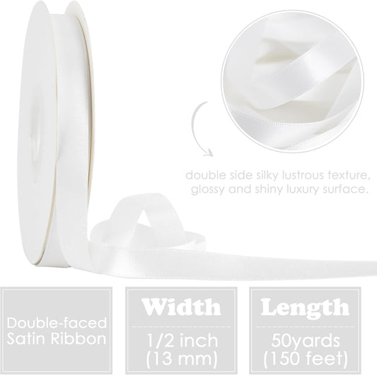 HUIHUANG White Satin Ribbon 1/2 inch X 50 Yards Continuous, White Double-Faced Satin Ribbon for Gift Wrapping, Bows, DIY Crafts, Flower Bouquet, Wedding Bridal Shower Decor, Hairs
