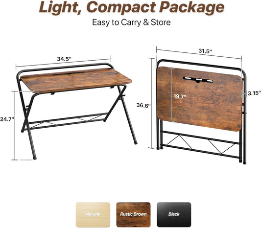 Huuger Folding Desk with 3-Level Adjustable Height and Tablet Slot, 32 Inch Foldable Computer Desk for Small Spaces, Space Saving, Writing Work Table for Home Office, Bedroom, Study, Rustic Brown