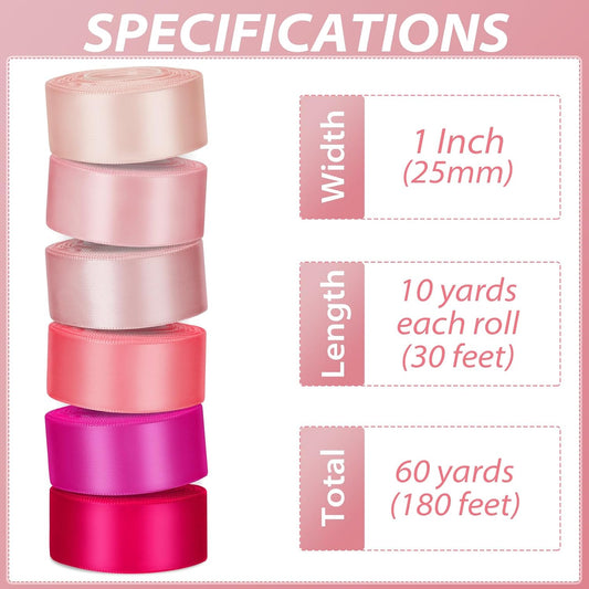 1 Inch Pink Satin Ribbons for Crafts, 6 Rolls Single-Faced Pink Assorted Ribbons for Gift Wrapping Flower Bouquet Wedding Invitations Bridal Shower Hair Bows Garland Party Decor
