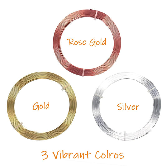 Cinvo 3 Rolls Flat Craft Wire Jewelry Wire Flexible Aluminum Wire Tarnish Resistant for Bezel Sculpting DIY Jewelry Craft Making (1mm Thickness, 3mm Width, Silver, Gold and Rose Gold)