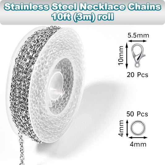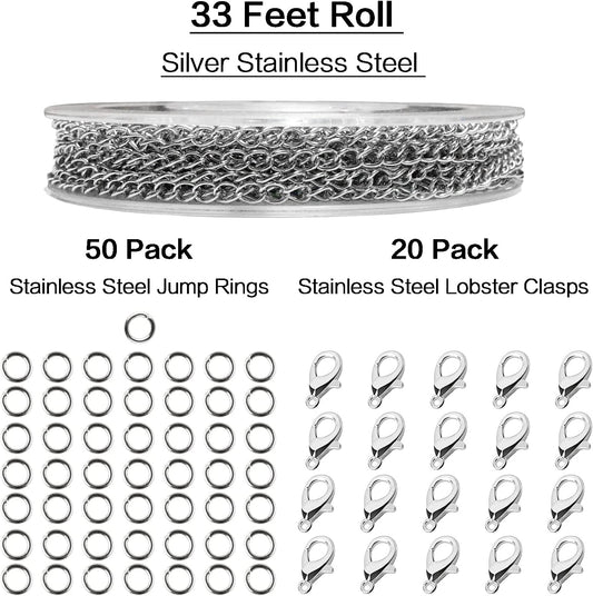 Jishi 33ft Silver Stainless Steel Chain 2mm Jewelry Necklace Link Cable Chain for Jewelry Making Bracelets Earring Craft Supplies DIY Findings - Metal Rolo Link Chain Roll w/Lobster Clasps, Jump Rings