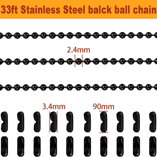 Jishi Steel Ball Chain Bead Dog Tag Chain Beaded Necklace Chains for Jewelry Making Bracelet Military Crafts, Silver Metal Pull Chain Small Ball Bead Chain Roll w/20 Connectors (Black, 33ft 2.4mm)