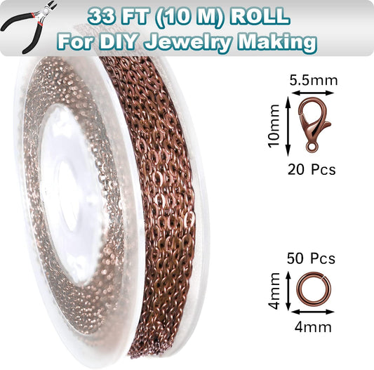 Jishi 33ft Link Cable Chain Roll 2mm, Red Copper Chain for Jewelry Making Necklace Earring Bracelet DIY Craft Jewelry Making Findings Supplies, Copper Plated Iron Metal Rolo Necklace Chain Spool Set