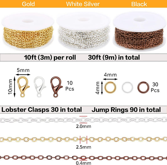 Jishi 30ft Jewelry Making Chains Bulk 2mm Necklace Chains for Jewelry Making Supplies, DIY Craft Earring Bracelet Making Findings, 3-Colors Gold Silver Black Plated Metal Rolo Cable Link Chain Rolls