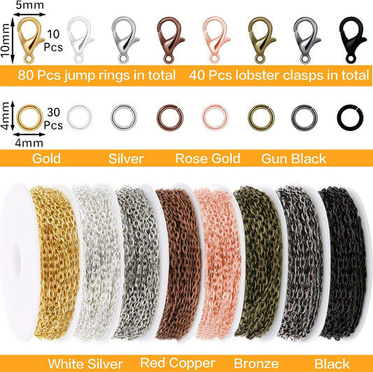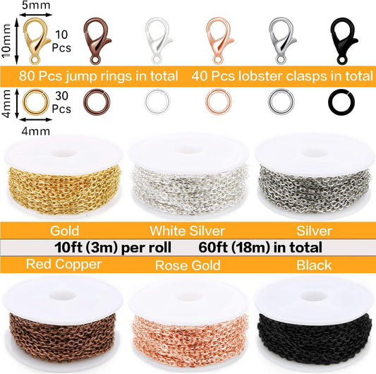 Jishi Chains Jewelry Making Supplies, 60ft Cable Link Chains for Making Jewelry Necklace Earring Bracelet Findings DIY Craft Kit for Adults, 6-Color 2mm Gold Silver Copper Plated Metal Link Rolls Bulk