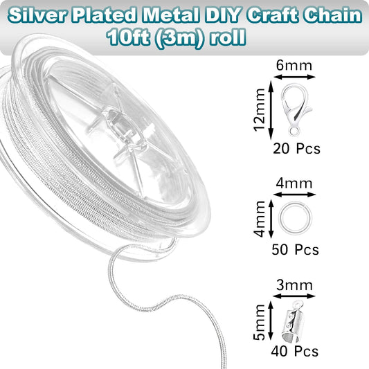 Jishi 33ft Silver Snake Chain 1.2mm Jewelry Making Chains for Necklace Bracelet DIY Jewelry Supplies Findings - Silver Plated Round Snake Cable Chain Link Roll w/Lobster Clasps, Cord Ends & Jump Rings