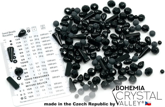 2.1oz (60g) of Glass Bead Mix with Drops, Table-Cut and fire Polish Czech Beads, Glossy & Matte Black