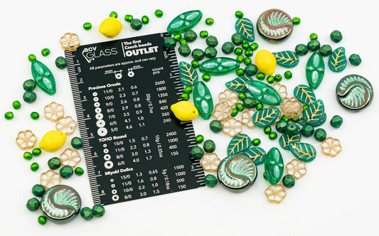 2.1oz (60g) of Focal Czech Glass Bead Mix with Lemon Shaped Beads, Seashel Beads and Leaf Beads, Emerald