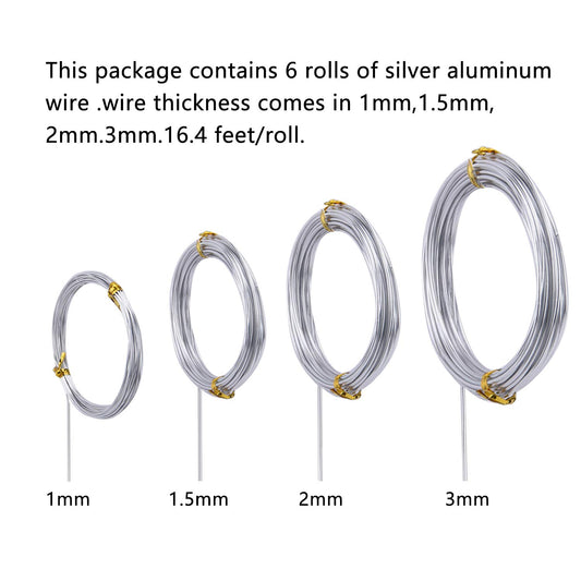 6 Rolls Silvery DIY Craft Art Aluminum Wire, 1mm, 1.5mm, 2mm, 3mm in Diameter