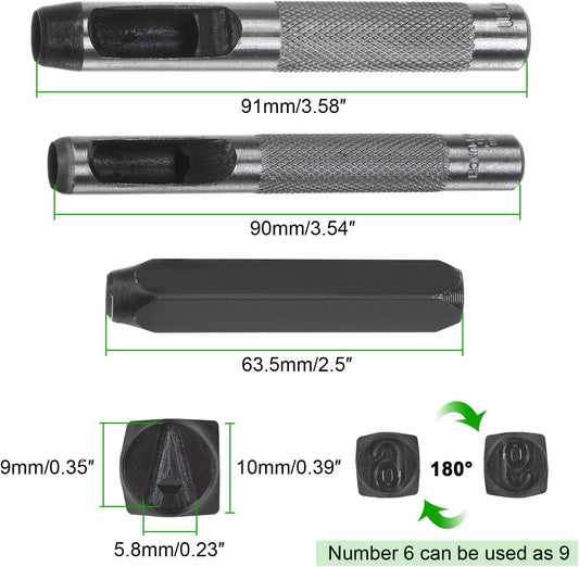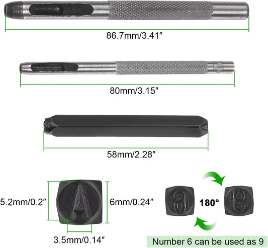 HARFINGTON 36pcs Metal Stamping Kit 1/8" (3mm) (A-Z, 0-8, "&" Symbol) Steel Letter Punch Press Tool with Hole Punch to Stamp on Metal, Plastic, Wood, Leather, Black