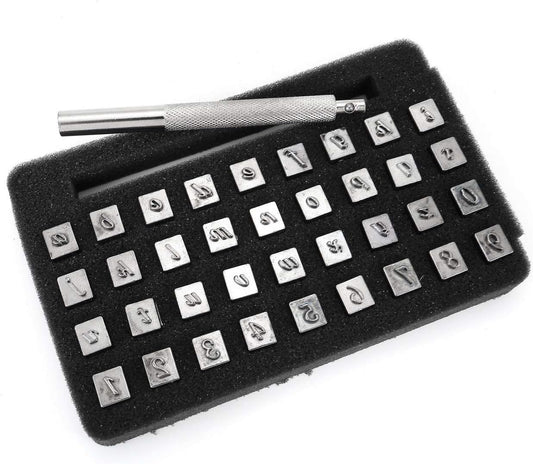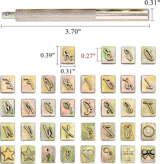 Yoption 37 Pieces Leathercarft Stamping Tool Set, 26 Letters Alphabet & 10 Patterns Stamping Tool 6mm +1 Stamping Handle for Leather Craft