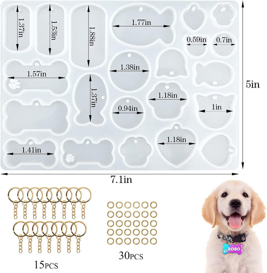 Actvty Pet Tag Resin Mold Silicone, Dog Tag Molds for Resin, Dog Bone Cat Shaped Keychain Silicone Resin Molds with 15Pcs Keychains DIY Crafts Making Tag Charm Pendant