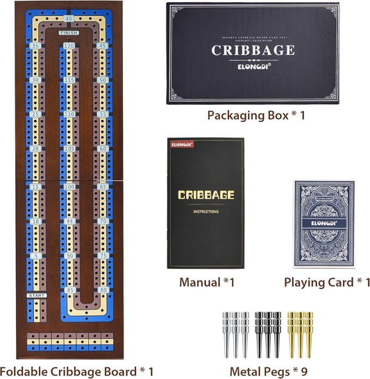 Cribbage Board Game Set - Wooden Foldable 3-Track Board with Magnetic Closure, 9 Metal Pegs, Playing Cards, Portable Family Travel Game for Gatherings and Gifts