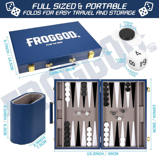 Froggod Travel Backgammon Sets for Adults – 15 Inch Premium Backgammon Set – PU Leather Case with Seamless Flocked Game Surface – Classic Board Games for 2 Player and Gift for Men(Dark Blue)