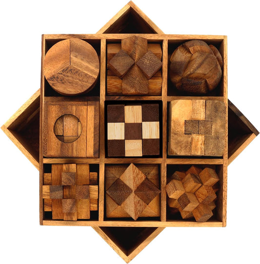 BSIRI 9 in 1 Wooden Brain Teaser Puzzles for Adults Teens and Kids Box Set for All Ages Wood Hard Level 10 Impossible Mind Wood Brain Teaser Games 3D Hand Puzzle Sets for Decoration and Mini Toys