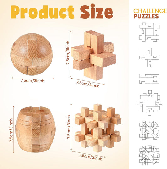 BSIRI Wooden Puzzle Box Set (4 Games) - Challenging Brain Teasers 3D Puzzles for Adults, Interlocking Games for IQ Test. Ideal for Rustic Patio Decor, Unique Gift for Christmas and Birthdays