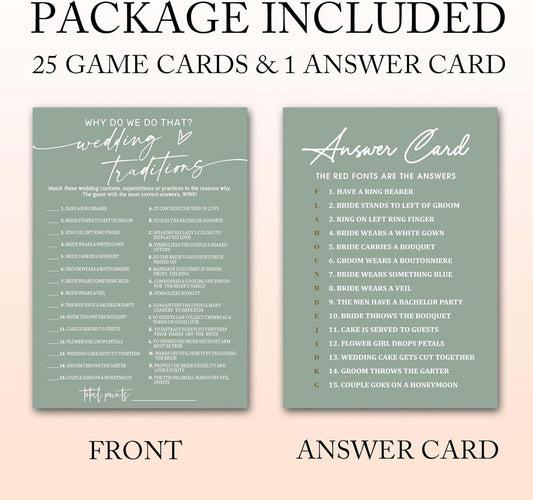 Bridal Shower Games Cards, Wedding Traditions Why Do We Do That, 25 Game Cards with 1 Answer Card, Engagement Party Wedding Games for Guests, Minimalist Green Wedding Party Supplies - C08