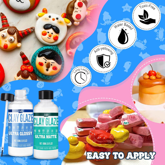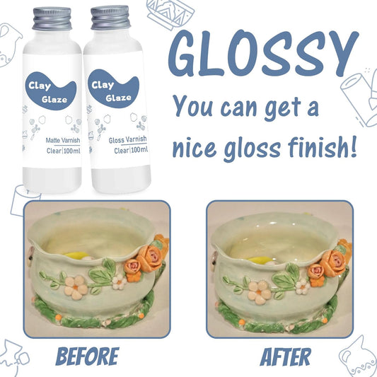 Air Dry Clay Glaze - Upgraded Polymer Clay Glaze, 2 x 100ml Ultra Gloss and Matte Finish Varnish Pottery Glaze, Clay Sealant to Prevent Scratches, Wear, Cracking - Professional Clay Tools, Quick Dry