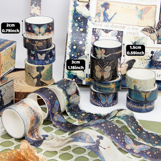 14 Rolls Washi Tape Set - Gold Foil Green Fairy Decorative Masking Tape Butterfly, Fairy, Star, Magic, Adhesive Tape for Bullet Journal,DIY Craft,Scrapbooking Supplies,Gift Wrapping