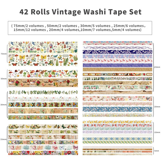42 Rolls Vintage Washi Tape Set, Floral Letter Butterfly Mushroom Botanical Flower Writable Decorative Tapes for Scrapbooking , Junk Journal Supplies, Bullet Journaling 5-75mm Wide 9.84ft long/Roll