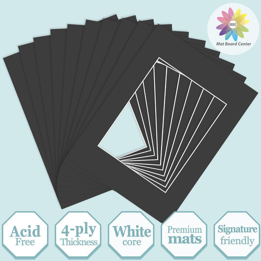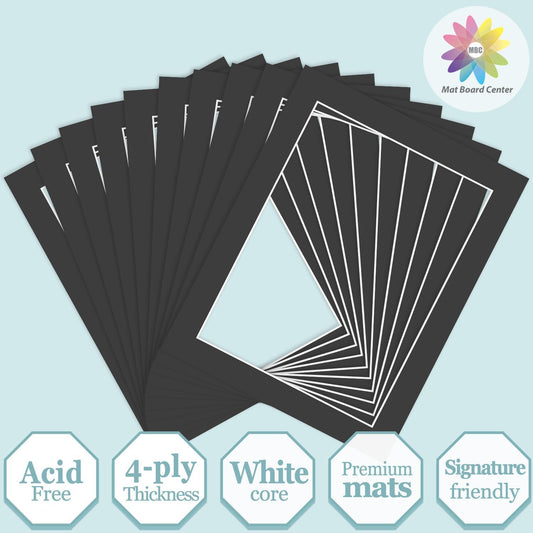 Mat Board Center, Pack of 10, 11x14 for 8x10 Black Color Mats - Bevel Cut, Acid Free, 4-ply Thickness, White Core - for Pictures, Photos, Framing