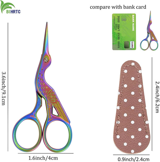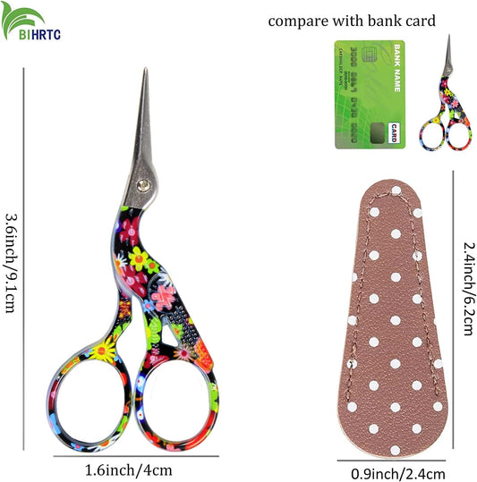 BIHRTC 3.6 Inch Small Crane Precision Detail Scissors Protective Leather Cover Stainless Steel Sharp Tip Needlepoint Scissors for Sewing Crafting Embroidery Scrapbooking