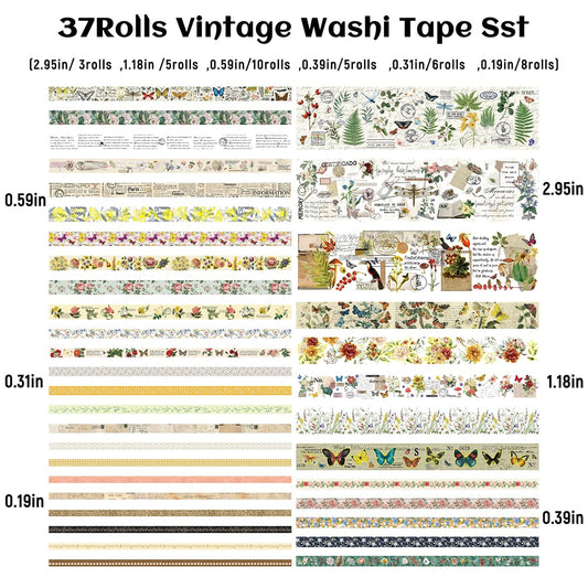 37 Rolls Vintage Washi Tape Set - Decorative Tape Floral Butterfly Mushroom Botanical,Adhesive Tape for Journaling Supplies,Scrapbooking,Junk Journal Supplies5/8/10/15/30/75mm Wide9.84ft Long/Roll