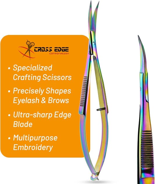 Cross Edge Curved Spring Scissors 5 Inch Stainless Steel Precision Eyebrow & Eyelash Shaping & Trimming Scissor, Snips Squeeze, Embroidery, Knitting Micro Tip Craft Scissors (Rainbow)