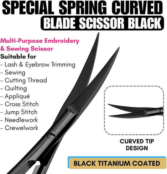 Cross Edge Curved Spring Scissors 5 Inch Stainless Steel Precision Eyebrow & Eyelash Shaping & Trimming Scissor, Snips Squeeze, Embroidery, Knitting Micro Tip Craft Scissors (Black)