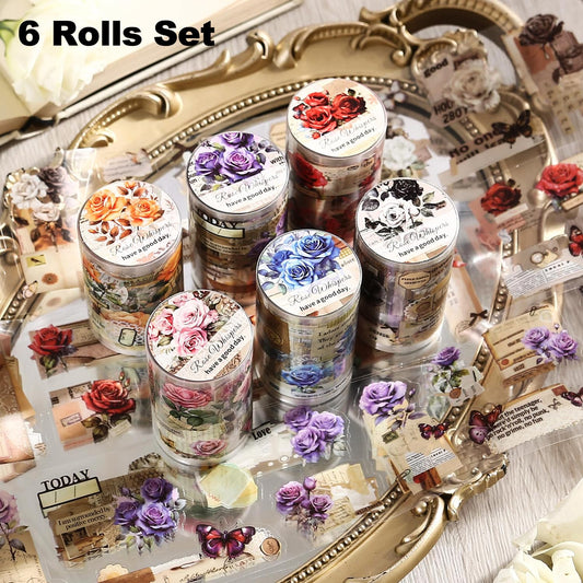 6PCS Baroque Flower PET Tape Set, Vintage Floral Pre-Cut Tapes for Journaling, Scrapbooking, and Junk Journal Ephemera, with Decorative Clip