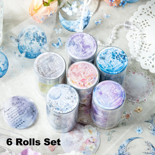 6 Rolls Moon Flower PET Tape Set, Pre-Cut Aesthetic Stickers for Journaling, Scrapbooking, and DIY Crafts, with Decorative Clip