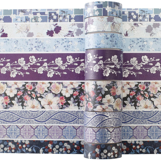 YUBX Elegance Blue Washi Tape Set 8 Rolls Wide Silver Embellishment Decorative Masking Tapes for Arts, DIY Crafts, Journals, Planners, Scrapbook, Wrapping