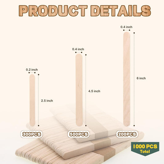 1000PCS Wooden Sticks for Craft, 3 Sizes (2.5",4.5",6") Natural Wood Popsicle Sticks for Ice Pops Waxing Hair Removal and Wax Supplies Classroom Art DIY Paint Craft Project Tongue Depressors