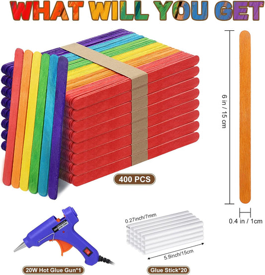 6 inch Colored Wooden Sticks Kits, 400PCS Colorful Rainbow Sticks with Hot Glue Gun and Sticks for Craft Home Popsicle Decoration Project Building Model Kid Classroom Art Craft Supplies