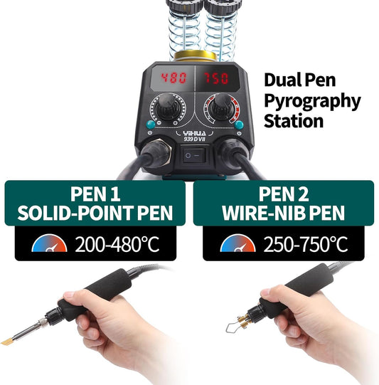 YIHUA 939D-VII Pyrography Tool Wood Burning Pen Kit Station 2-in-1 Solid-Point 200~480°C (with Temp Display)/Wire-Nib 250~750°C with 23 Nibs, 50 Solid Points, 6 Woodpieces