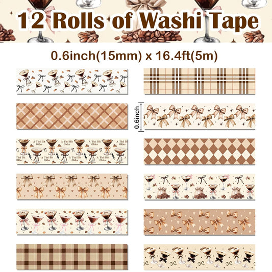 12 Rolls Martini Washi Tape, Vintage Brown Checkered Bow Masking Tape, Martini Coffee Decorative Sticker for Party Afternoon Tea Holiday Scrapbook Journal DIY Craft Gift Wraps 16.4FT