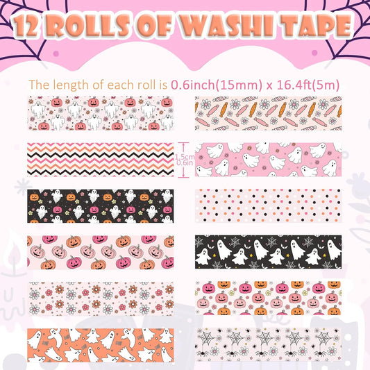 12 Rolls Halloween Washi Tape, Cute Ghost Pumpkin Spiders Masking Tape Boho Holiday Decorative Tapes Set for Scrapbooking, DIY Crafts, Party Decor 16.4FT