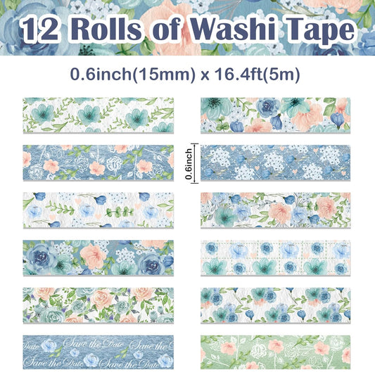 12 Rolls Floral Washi Tape, Blue Rose Flower Masking Tape, Vintage Blue Pink Floral Decorative Tapes for DIY Craft Scrapbook Journals Envelope Thanksgiving Christmas Party Decor Gift Wrapping 16.4FT