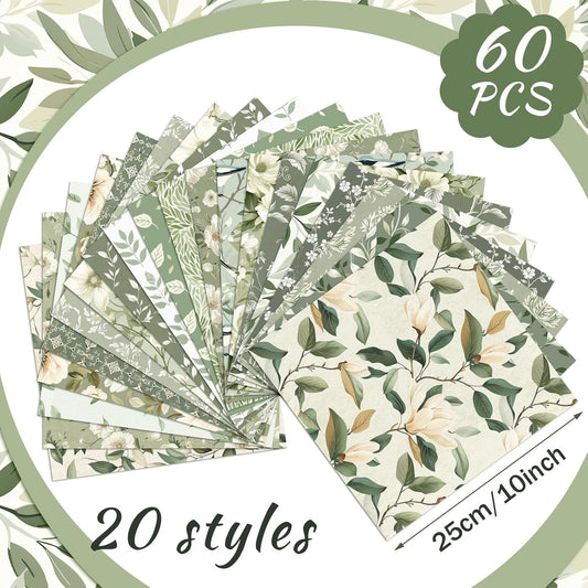 Ganeen 60 Pcs 10 x 10 Inch Sage Green Floral Quilting Fabric Squares Vintage Greenery Fat Patchwork Precut Strips Retro Eucalyptus Printed Fabric Bundles for Holiday DIY Craft Sewing Quilt Material